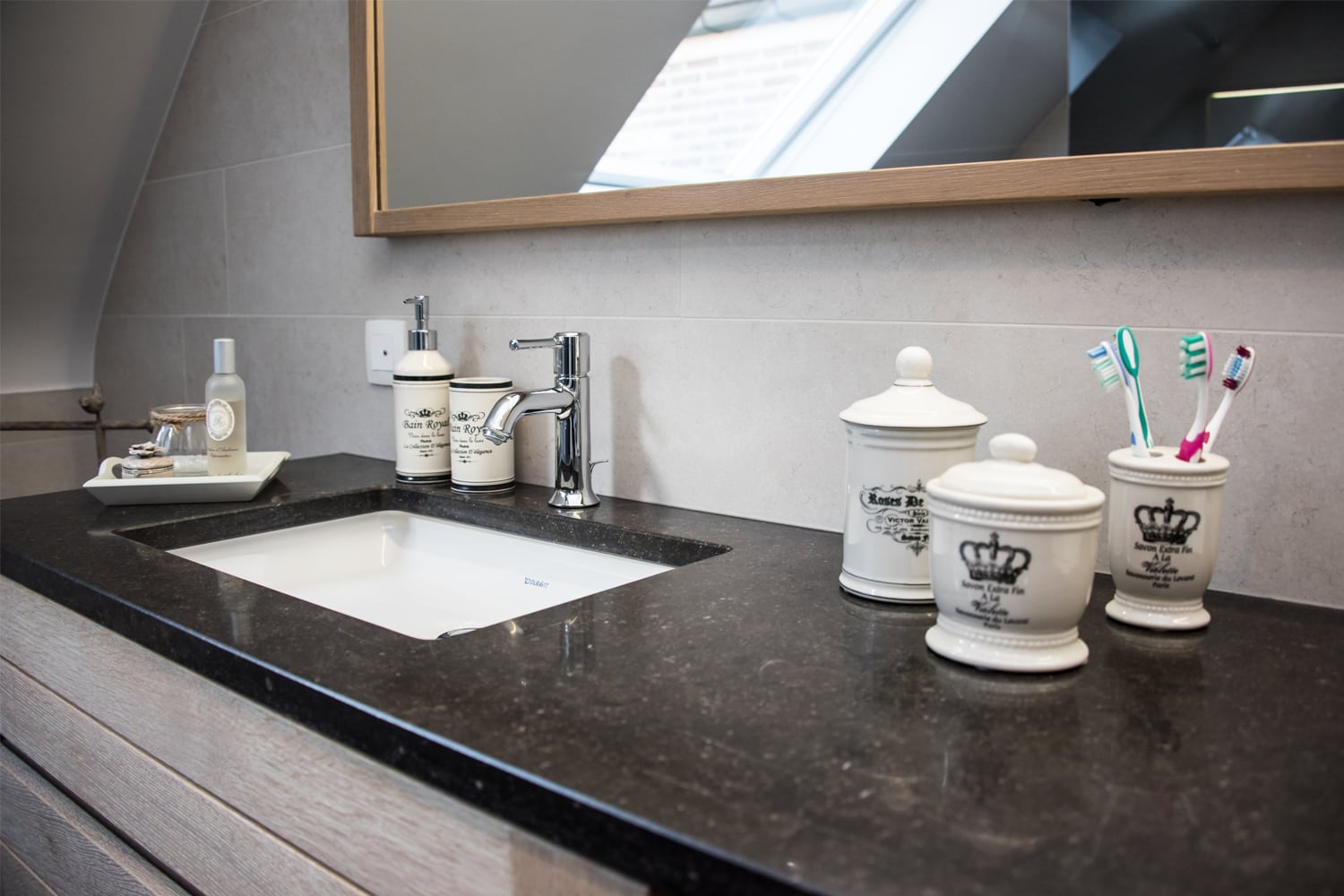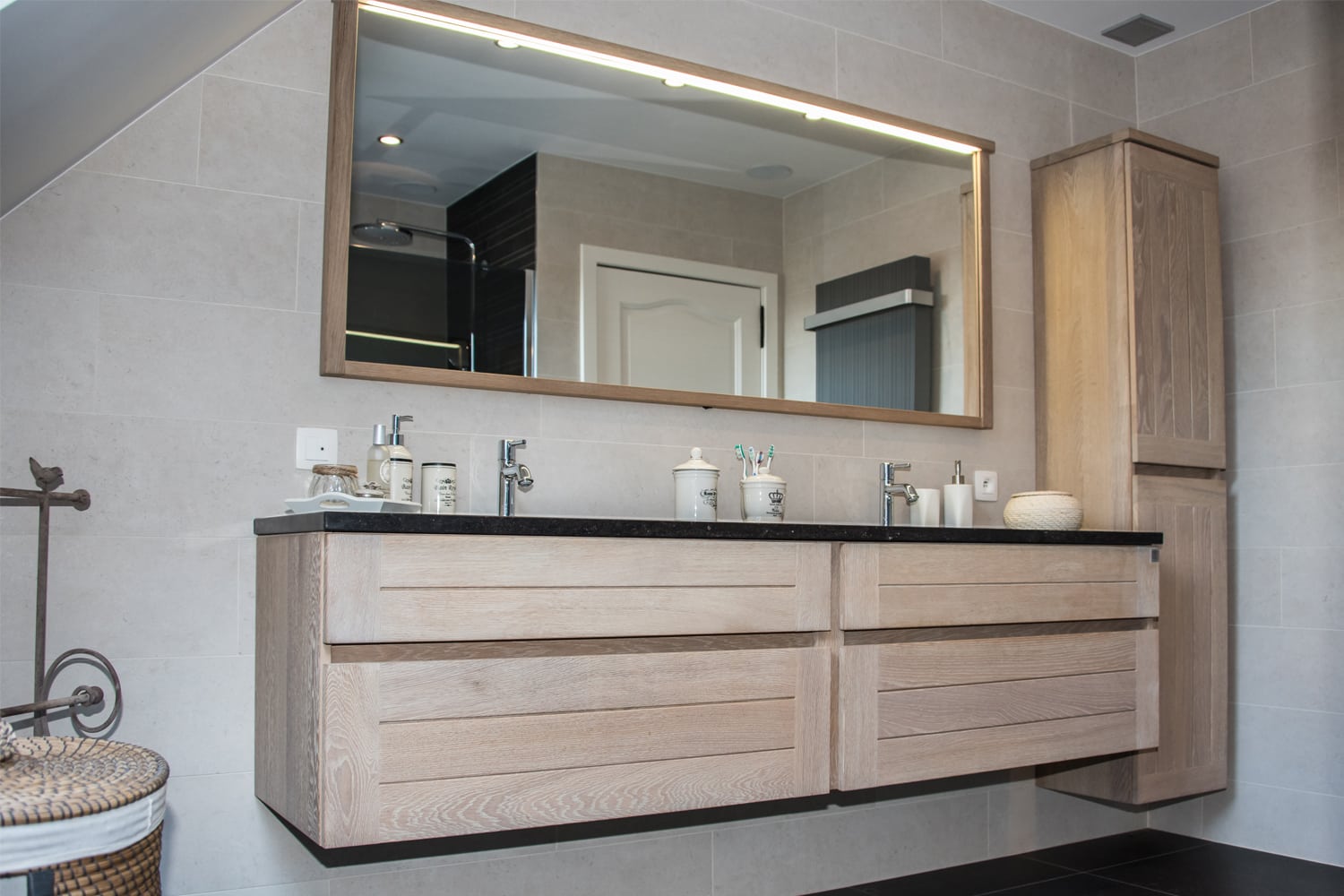 Een schuine wand kan een serieuze uitdaging zijn bij het ontwerpen van een badkamer. Bij deze renovatie zorgt het dakraam in die schuine wand net voor een prachtige lichtinval. Gecombineerd met de kwaliteitsvolle materialen leverden we hier een knap design af.