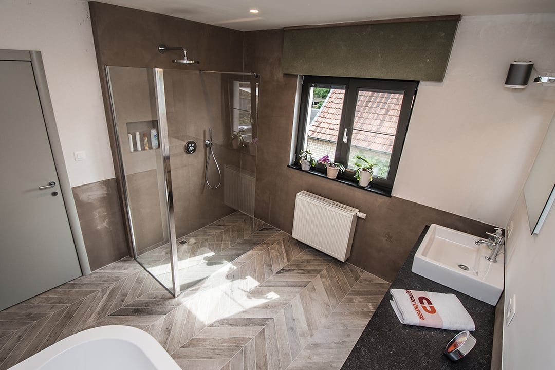 Hoe combineer je een inloopdouche, een vrijstaand bad en een toilet zonder het ruimtegevoel in de badkamer te verliezen? Geen eenvoudige opdracht, maar het lukte ons. De keramische tegels met beton zijn echt de ‘finishing touch’.